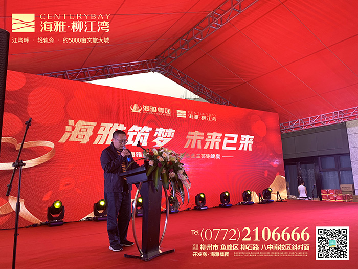 活动于下午六点正式开始,主持人登台讲话,一段3D开场舞过后,在全场嘉宾的瞩目下,海雅集团柳州分公司董事长詹波上台致辞,对关心和支持海雅柳江湾项目的各界嘉宾表示热烈的欢迎和衷心的感谢,向业主们介绍了海雅的近年取得的卓越成就,并对海雅品牌及项目规划做了相应的介绍,表示海雅柳江湾作为柳州划时代意义的文旅大作,将成为柳州人居新主场的决心。令在场的嘉宾无不对其表达了高度赞许与热情的期待。