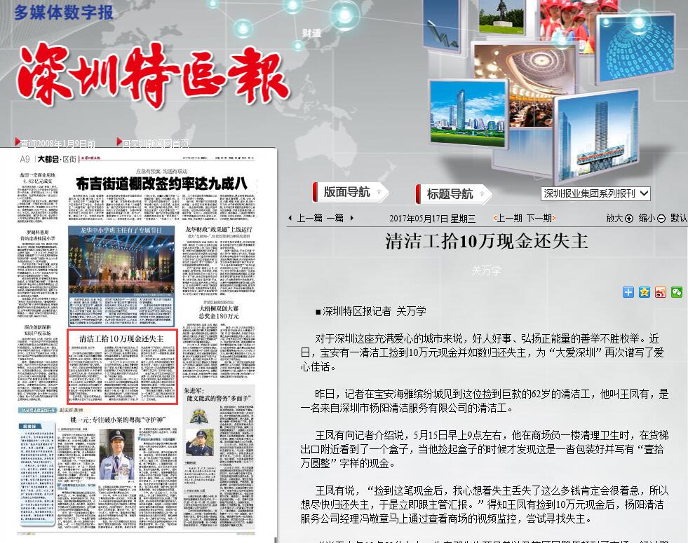 深圳特区报|拾金不昧 弘扬正能量——宝安海雅缤纷城清洁工 2017-05-18